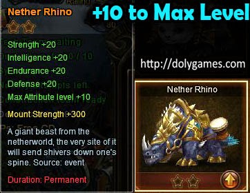 Hey guys, thanks to Rhino some of you will be able to get 1600+ sylph equipment shards. How? Well a lot of free players / light cashers had maxed out the stables levels and could not train anymore, but thanks to the new patch we have a chance to get the Nether Rhino mount and if you look at his stats you will see that he raises the maximum attribute level by 10, which is huge!