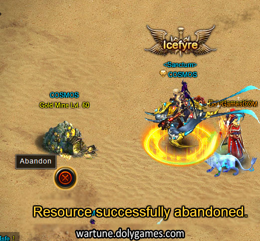 Although I got a range of tricks, my easiest and fastest trick to fill up my HP is attack a Gold Mine in the wilds, then heal with my Advanced Healing Rune right at the beginning (and if i didn’t forget my kid will heal me 1 time also) then troops usually kill of the boob guarding the mine. Then, as you come out, click on the mine again and you will get a red cross circle icon to abandon the mine (see picture below) – click on it and you will get the notice “Resource successfully abandoned”. Then attack it again and again to fill up your HP.