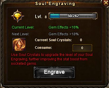 2.The Soul Engraving EXP will be gained when you consume the soul crystals to do the Soul Engraving(1 soul crystal consumed = 1 Exp ), thus the level of which will be raised. And with the Soul Engraving leveling up, the stats boots provided by socketed gems will be further improved Wartune