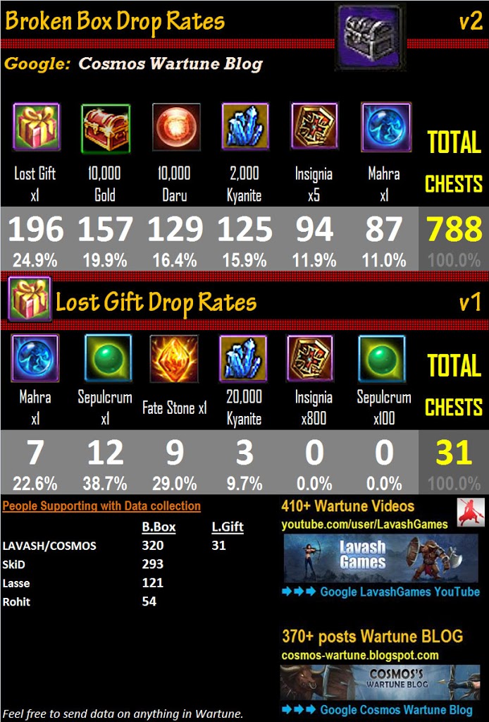 Hey guys, here I have the Broken Box & Lost Gift Drop Rates Version 2 which were Wartune event items. They might still repeat, who knows, so here are the drop rates report that I put together.