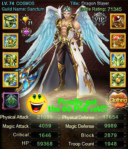Hey guys, after a long time I finally got the Level 60 PvE set and also made it legendary. Especially the last Wartune update helped a lot as only one mpd is now needed per day – I just could not find the time to do 3 per day and often missed them in the past. Anyhow, sooner or later, as long as you don’t quit, you will get what you want in the game 🙂 and for me this was a big step forward – definitely a huge milestone for COSMOS in his life in Balenor 🙂