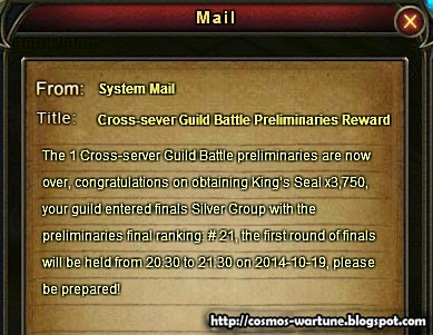 Now that the Preliminaries are over everyone in our guild got the King’s Seals rewards based on the performance of our guild. Here is the mail with 3750 reward: