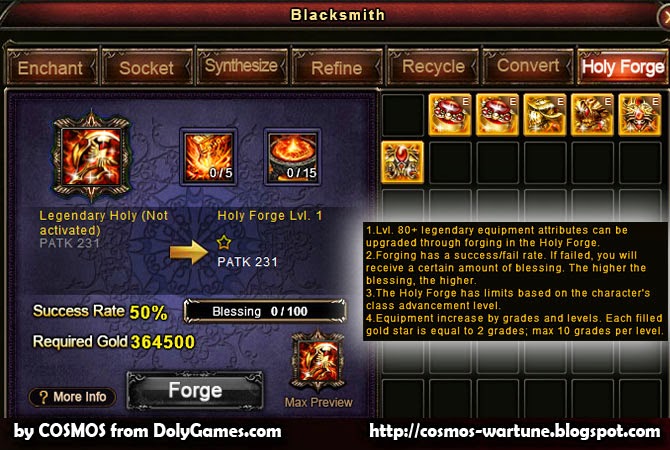 Here is what Holy Forge looks like for those who don’t have access to it. The issue here is that the success rate is 50% (although it rises with failed attempts – UPDATE: see correction below), so it is very expensive to get this going, so for those people who don’t have high star clothing refinement probably Fashion Cores will be a better idea.