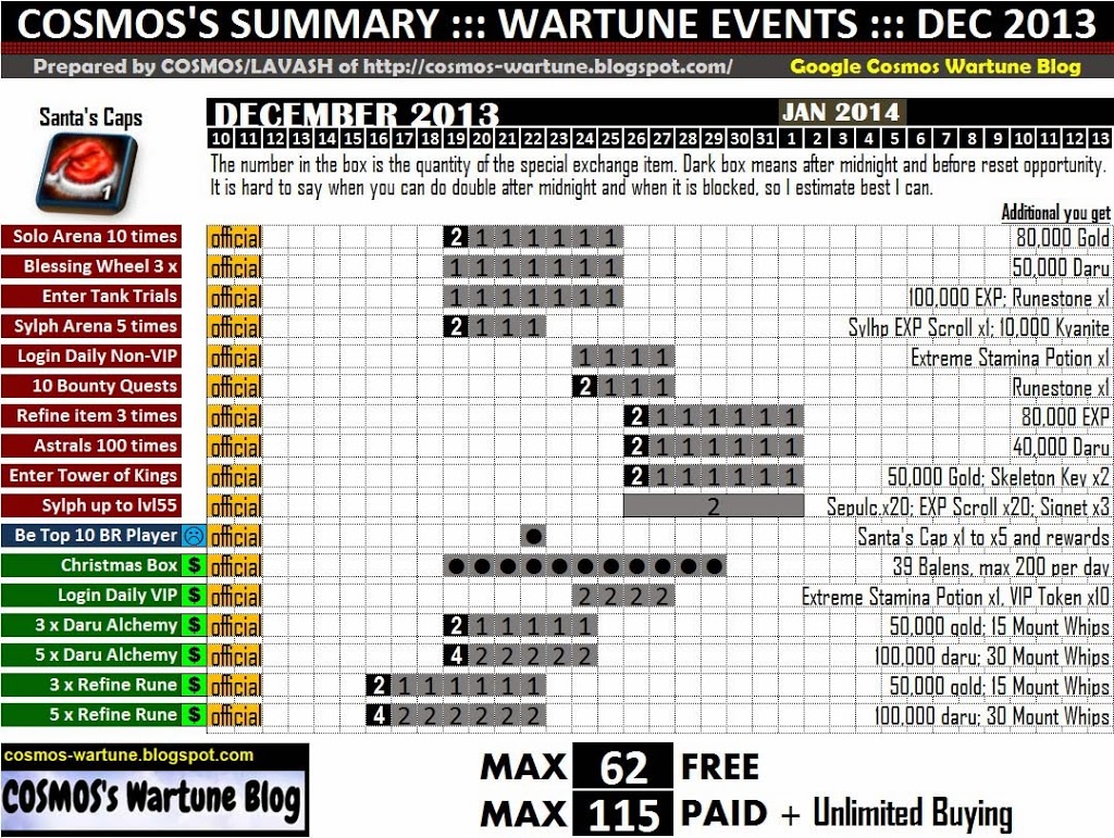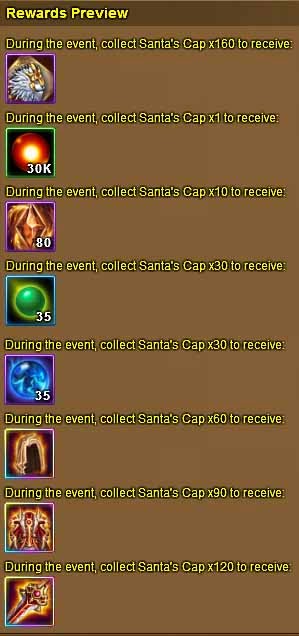 Hey guys, as events are very important in Wartune especially for free players or non-cashers to get special items I have made the below illustration of the Wartune December 2013 events and the rewards that you can get in it, i.e. the special items: Santa’s Caps, so check it out below and make good planning so that you benefit the most.