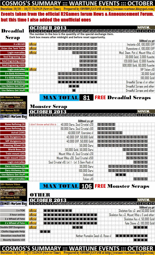 Hey guys, as events are very important in Wartune especially for free players or non-cashers to get special items I have made the below illustration of the Wartune October 2013 events and the rewards that you can get in it, i.e. the special items: Dreadful Scraps and Monster Scraps, so check it out below and make good planning so that you benefit the most.