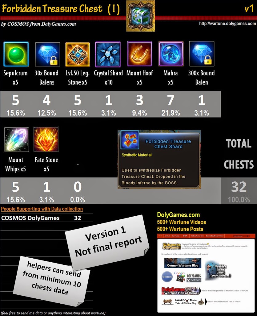 Hey guys, here below you see my drop rate report for the Forbidden Treasure Chest I, where I have been writing the items from my own chests. Same size is not huge at all, I have opened 32 chests so far and we can see there is a large variety of items falling from this chest, which is very nice.
