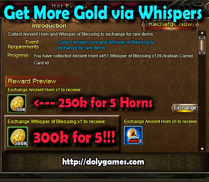 You see on the picture below that I have prepared that we get 50,000 gold for 1 Ancient Horn, but 300,000 gold for 1 Whisper of Blessing. However, we also have the option to exchange 5 Ancient Horns for 1 Whisper of Blessing, so if you put all that together you can get 50,000 extra gold or 20% more if you switch-over your 5 Ancient Horns into 1 Whisper of Blessing and then into 300,000 gold. (Thanks to Vilniausturt from miniclip5 server for sharing this tip).