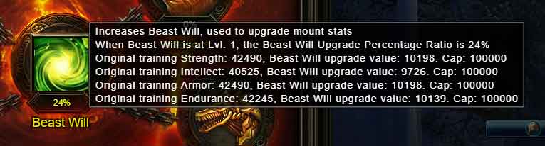 - Beast Will: When the attributes from your Original Mount Training Value is multiplied by the Beast Will Upgrade Percentage Ratio, you get the Beast Will Upgrade Value, this value has a fixed cap.
