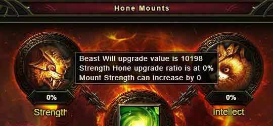 - Beast Will Upgrade Value: Hone your Mounts to raise your Beast Will Upgrade Value. The Beast Will Upgrade Percentage Ratio then converts your Beast Will Upgrade Value into bonus attributes, which represent the full attribute benefits from the Hone Mounts system.
