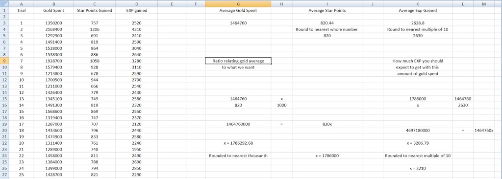 The far left side of the picture should be pretty self explanatory. All it is are the trials that I did (total of 25) and how much gold I spent for each trial, how many star points were gained, and how much EXP was gained from that run.