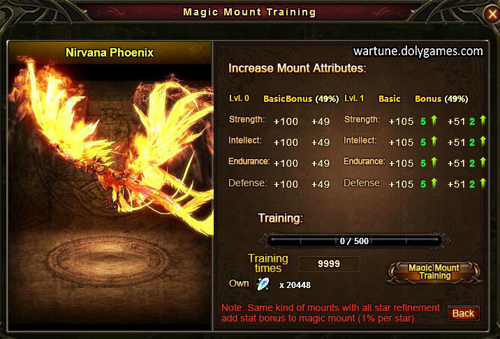 On the image below from Alan we can see the Nirvana Phoenix leveled up to the maximum, which is level 180 (Russian Wartune version). Although the Wartune language/version is different I do believe the stats / numbers are the same as our Western Wartune. So for this mount training up to level 180 Alan has spent about 170,000 mount training whips – a pretty massive amount 🙂