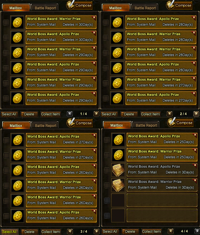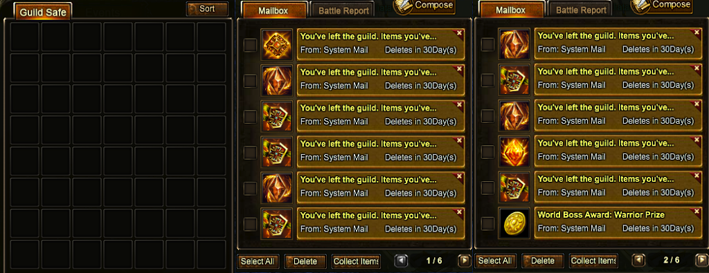 Using the game mailbox is a great way to save some backup gold from world boss rewards. As long as you don’t click on them, mail messages do not expire for 30 days (drops to 3 days once you view the contents).