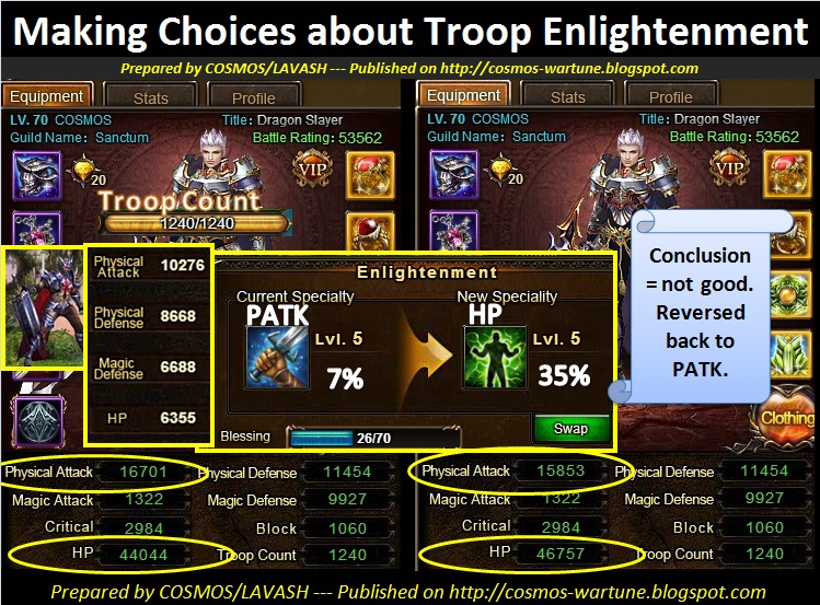 Hey guys, here I want to share with you an analysis and conclusions about making choices when it comes to troop enlightenment. Many of you might already know my original opinion about troop enlightenment, which is to go attack all the way all the time. That is for everything in Wartune when making a choice to always prioritize attacking for the main reason of making more income from the World Boss.