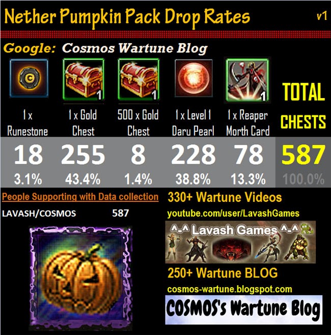 Hey guys, here we have the drop rates for the Wartune Nether Pumpkin Pack which you get from the Monster Scrap event where you get the pumpkin seeds, plant them in your farm for 12 hours (or less depending on your farm level) and then you get the pumpkin pack which can have one of the below items.
