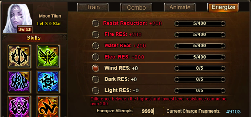 Players can make gains to their base resistances by consuming Charge Fragments in the Energize tab.