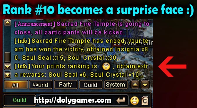 Check it out, at the end of the Sacred Temple, if you are ranked #10 you get the following chat notification, which looks like the game is shocked or surprised at your performance 🙂 hehe.