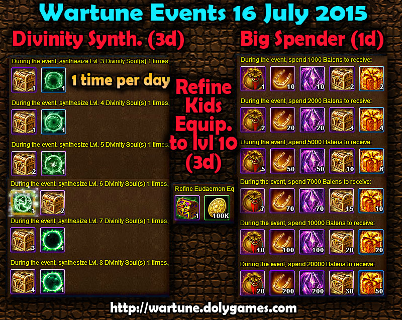 Hey guys, here are the Wartune Events 6 July 2015: Sylph Equipment Enchanting, Eudaemon Diamond Synthesis, Epic Miraculous Shard Exchange and the Big Spender