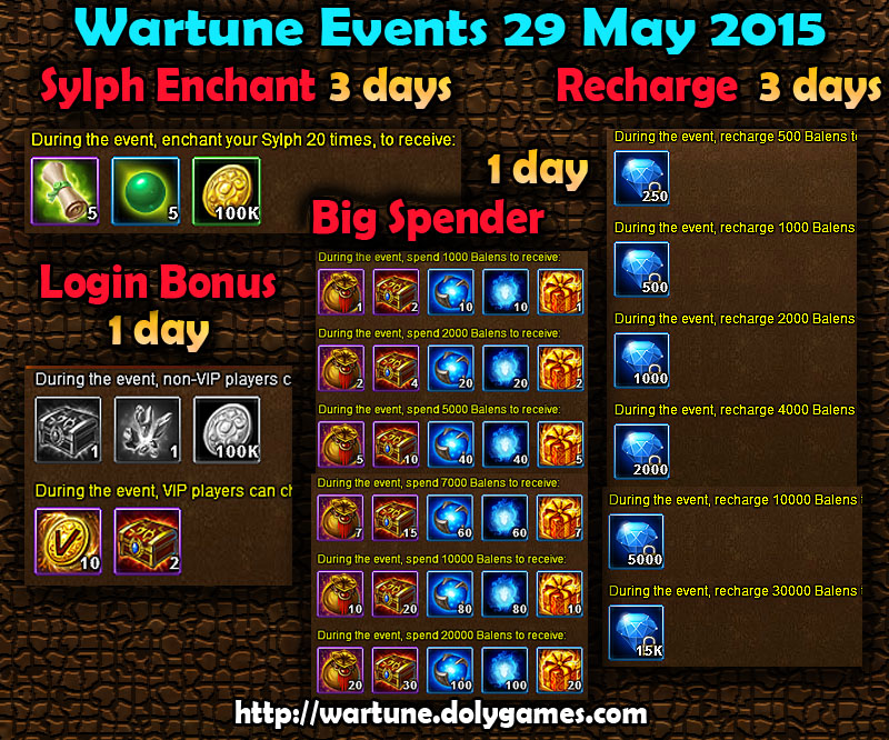 Hey guys, here are the Wartune Events 22 May 2015: Recharge (good one) + Big Spender + Eudaemon / kids equipment upgrade