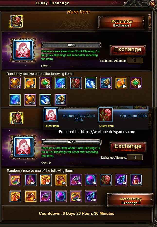 Wartune Lucky Exchanges MOTHER'S DAY 11 MAY 2018 -low