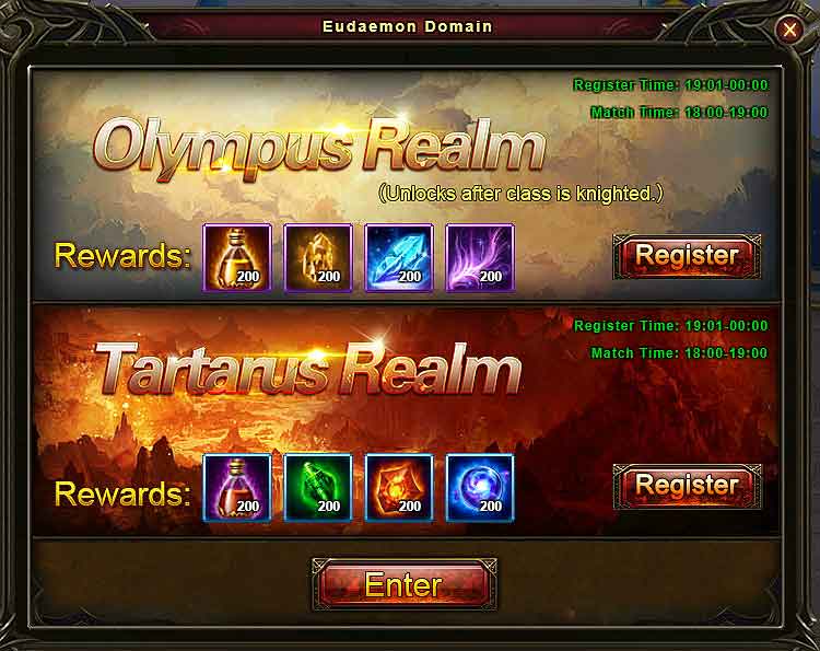 There are two competition sections: Olympus Realm and Tartarus Realm. Each gives different rewards and players can not choose to participate in both sections at the same time. Only Knighted players can enter Olympus Realm.