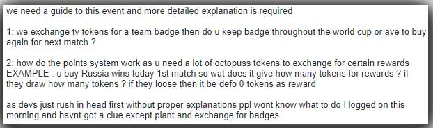 3. I have been forced to learn more about the World Cup, and in my case I have enjoyed learning more about real life football/soccer play. The lack of explanation can be very frustrating, but it is also what keeps me more actively engaged. I try to figure out strategies for each new event despite the implementation flaws and welcomed this special ones. Of course my primary source is your website. Thank you!