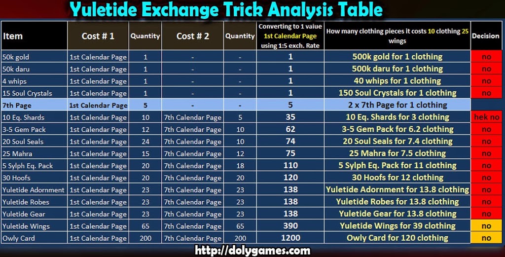 Hey guys, if you didn’t see the awesome Yuletide exchange trick that Elia shared then go check it out first before you see this analysis. Here I analyze if it is interesting to exchange clothing for the various rewards.